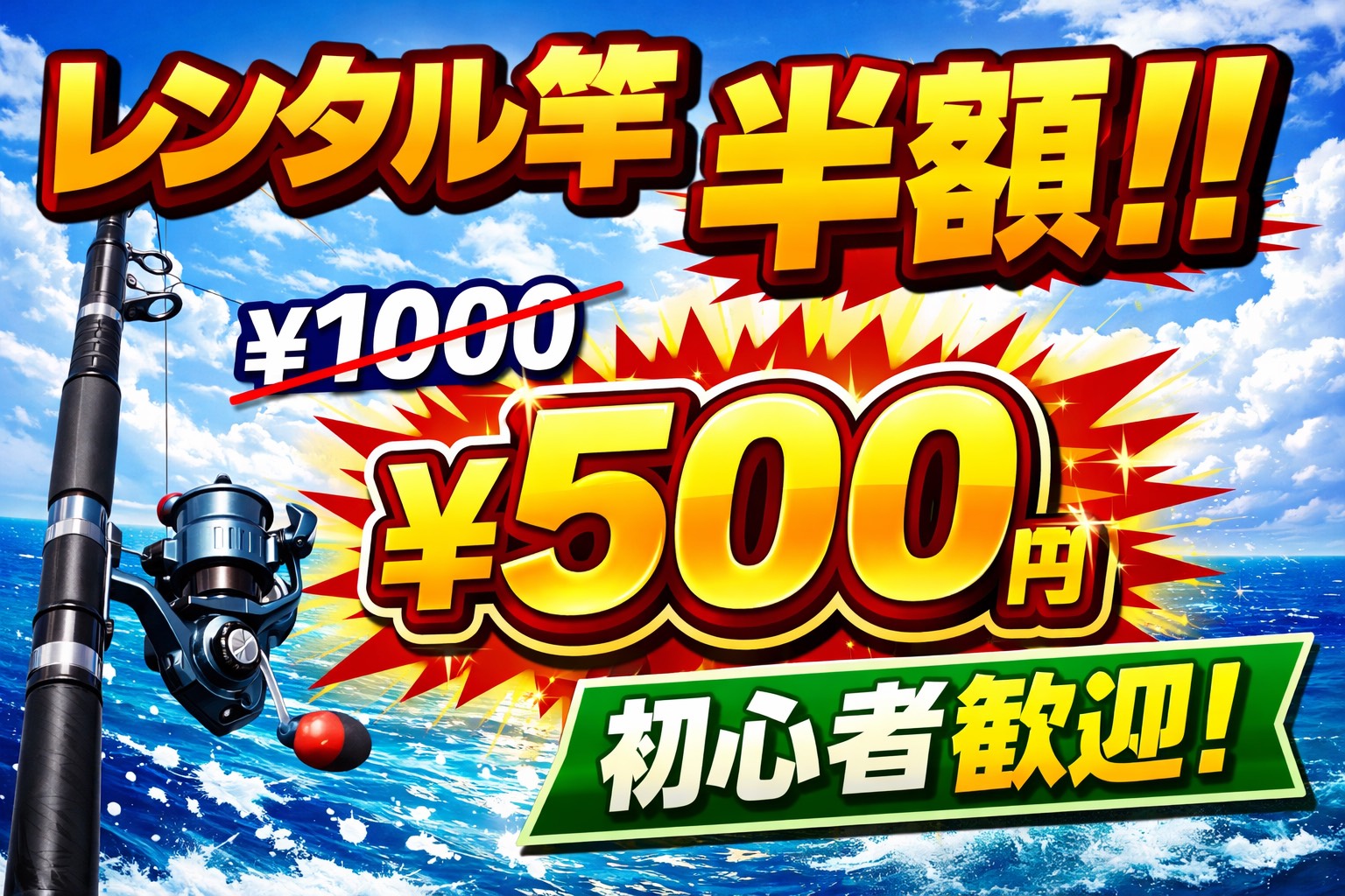 レンタル竿、ワンコイン(500円)になりました! 竿とリールの1セット